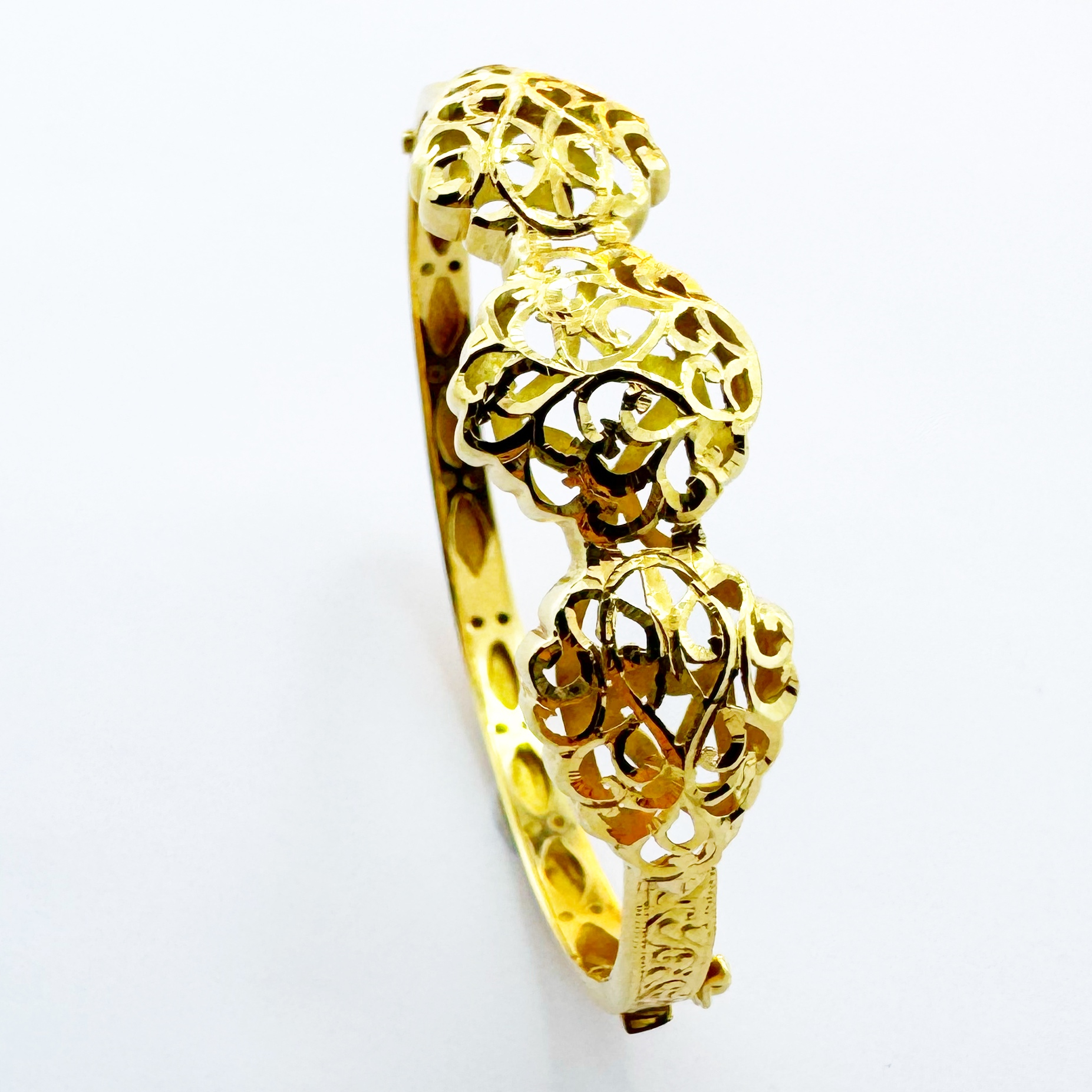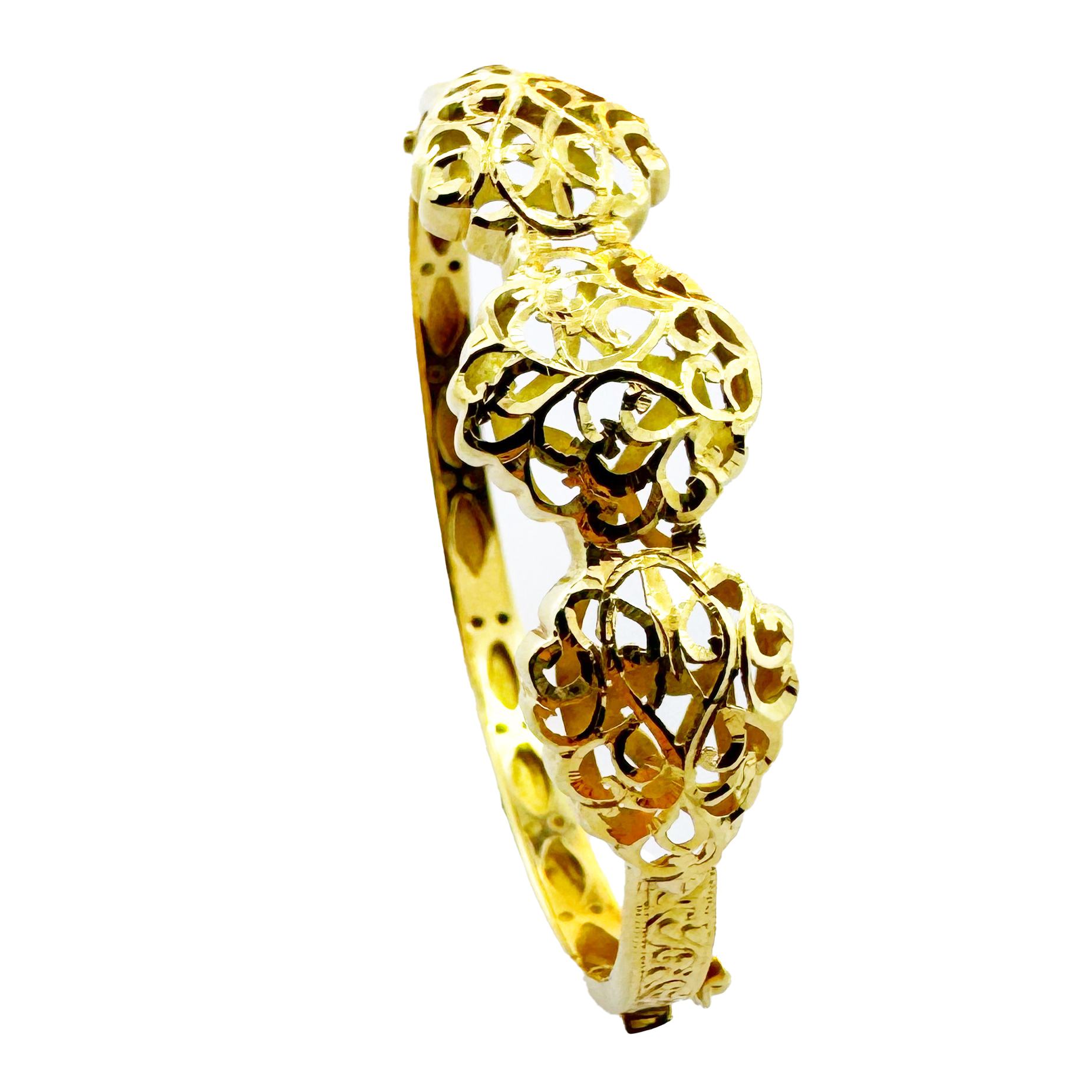Design : Large jonc avec trois grands motifs ajourés de style floral ou arabesque.