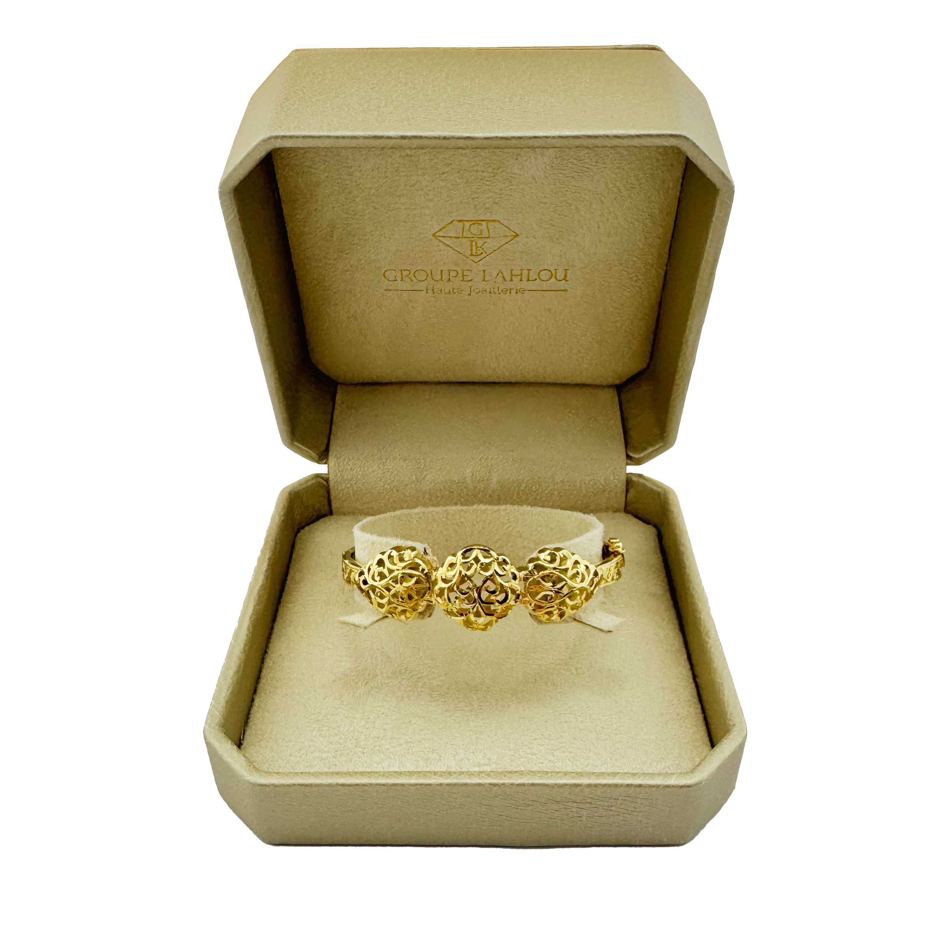 Un Héritage d'Art et de Tradition en Or Jaune 18K : Ce jonc majestueux est fabriqué en or jaune 18 carats (750/1000e), un métal précieux dont la richesse et l'éclat subliment ce design d'exception. Il se distingue par un design ajouré spectaculaire, composé de trois grands motifs floraux ou arabesques finement ouvragés, rappelant les décors des riads et palais marocains. Chaque détail, chaque volute, témoigne d'un savoir-faire artisanal séculaire, conférant au bijou une âme unique. Malgré son allure imposante, le travail ajouré lui donne une légèreté visuelle et un confort au porter. Le bracelet est doté d'un fermoir de sécurité intégré et discret, garantissant un maintien parfait tout en préservant l'esthétique du design. C'est le cadeau de luxe idéal en or jaune à Casablanca pour une mariée ou pour marquer une occasion solennelle.