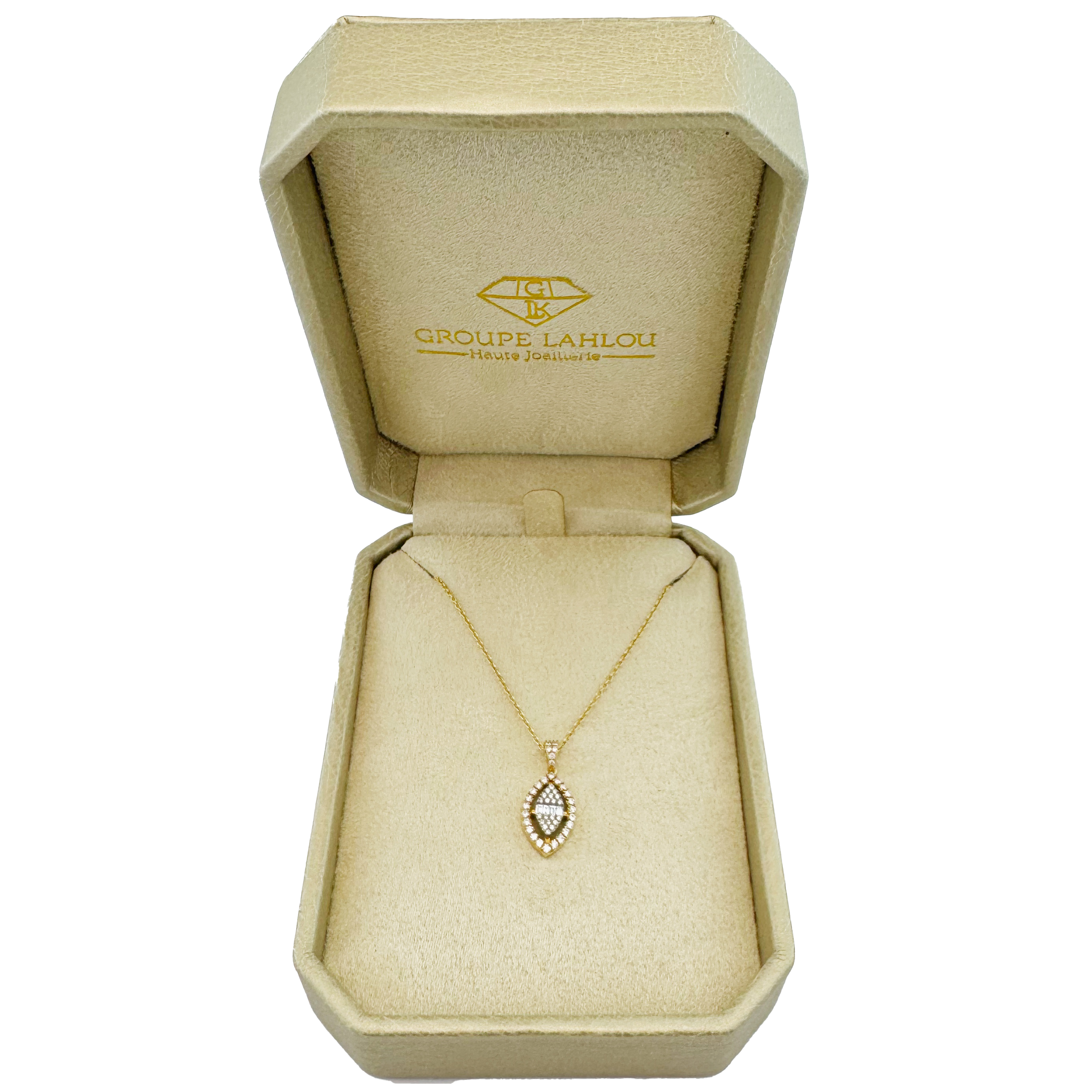 L'Harmonie de l'Or Jaune 18K et la Pureté des Diamants Naturels : Ce collier est méticuleusement façonné en or jaune 18 carats, un métal précieux dont la teinte riche et intemporelle met en valeur la brillance exceptionnelle des diamants. Sa conception se caractérise par une chaîne fine et ajustable, portant en son centre un magnifique pendentif en forme de marquise (ou œil). Ce pendentif est entièrement pavé de diamants naturels scintillants, créant une surface de lumière continue qui attire le regard. Chaque diamant que nous sélectionnons est choisi pour sa brillance exceptionnelle, sa pureté et sa taille parfaite, garantissant un feu et une scintillation qui émerveilleront à chaque instant. Le design allongé et la brillance intense confèrent à ce collier une allure résolument moderne et sophistiquée. Ce collier est idéal pour un port quotidien, ajoutant une touche de luxe discret, ou pour être superposé avec d'autres colliers pour un look tendance et personnalisé. Il représente un cadeau de prestige en or jaune et diamants naturels à Casablanca, parfait pour un anniversaire, une célébration ou simplement pour exprimer un style personnel raffiné.