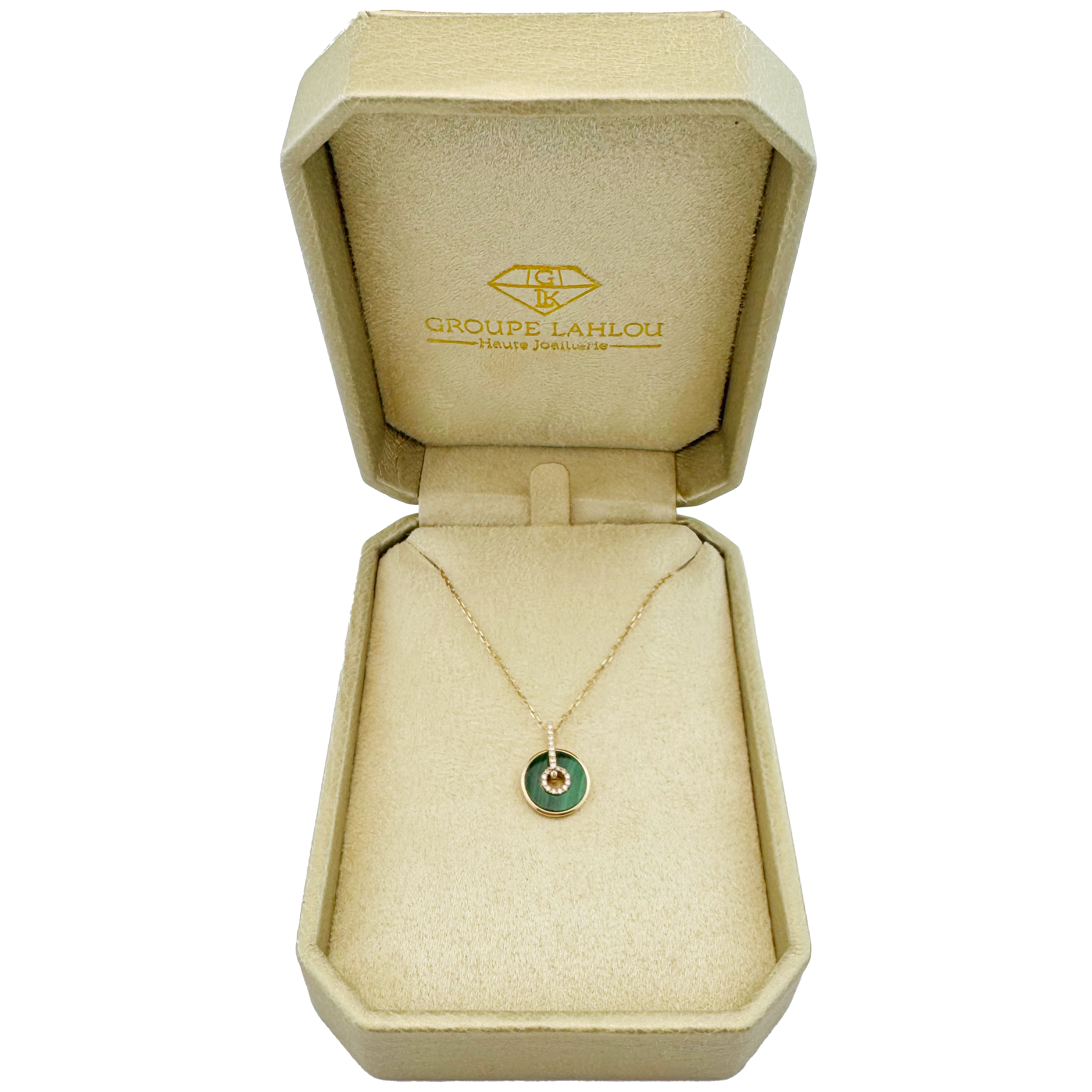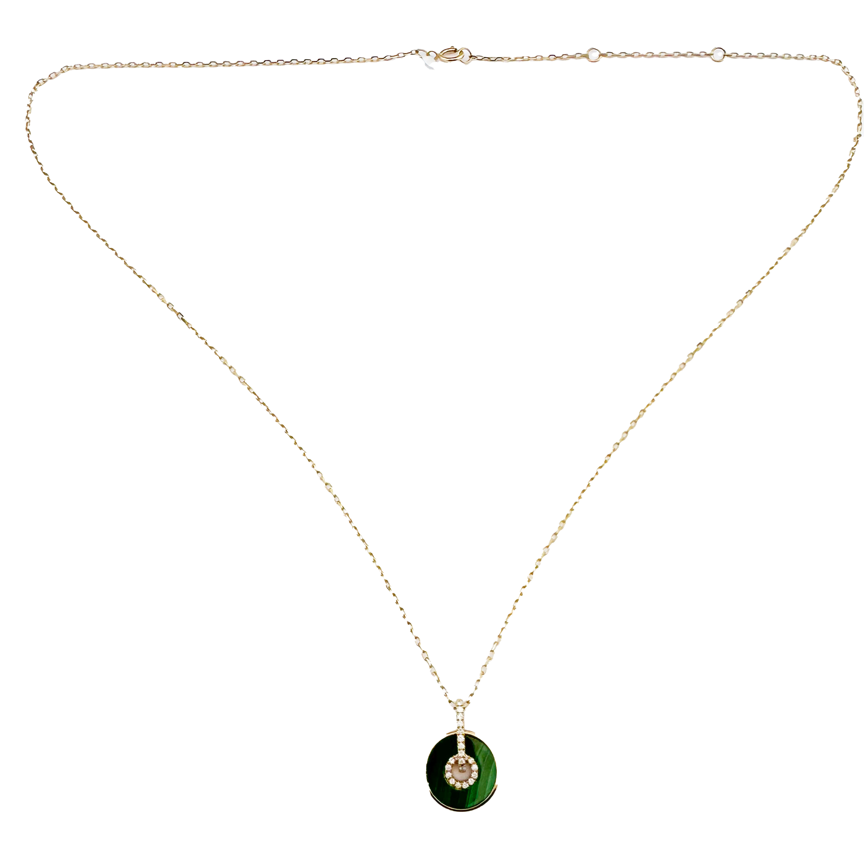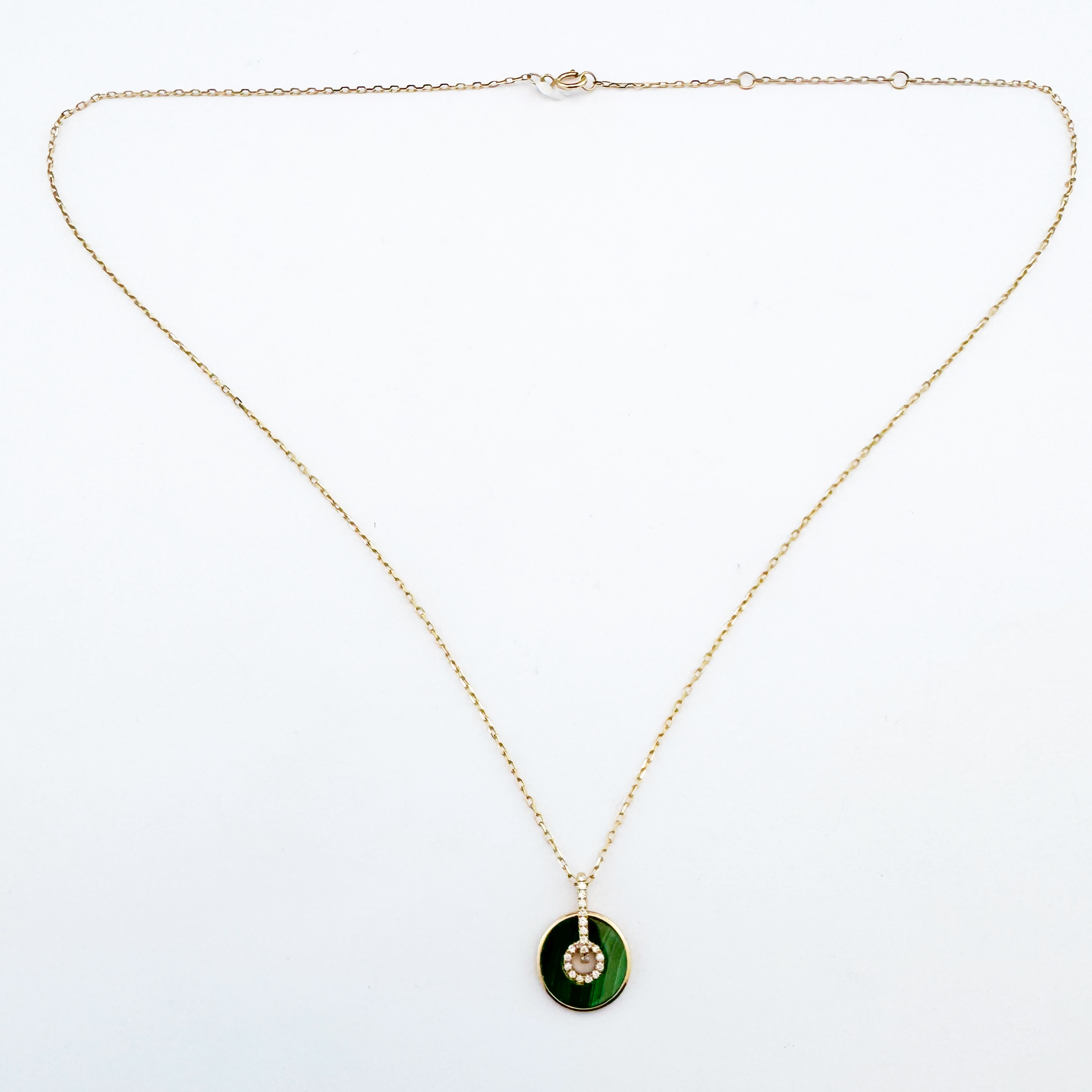 L'Harmonie de l'Or Jaune 18K, la Profondeur de la Pierre et l'Éclat des Diamants Naturels : Ce collier est méticuleusement façonné en or jaune 18 carats, un métal précieux dont la teinte riche et intemporelle met en valeur la complexité de son design. Sa conception se caractérise par une chaîne fine et ajustable, portant en son centre un magnifique pendentif circulaire en pierre de couleur foncée (verte ou noire, type malachite ou onyx). Cette pierre, d'une profondeur envoûtante, offre un contraste saisissant avec l'éclat de l'or. Au cœur de ce pendentif, un motif circulaire est délicatement serti de petits diamants naturels scintillants, créant un point focal de lumière intense qui attire le regard. Chaque diamant que nous sélectionnons est choisi pour sa brillance exceptionnelle, sa pureté et sa taille parfaite, garantissant un feu et une scintillation qui émerveilleront à chaque instant. Le mariage de la pierre naturelle et des diamants confère à ce collier une allure résolument moderne et sophistiquée, parfaite pour un port quotidien ou pour ajouter une touche de glamour à vos tenues de soirée. Il représente un cadeau de luxe en or jaune et diamants naturels à Casablanca, idéal pour un anniversaire, une célébration ou simplement pour exprimer un style personnel affirmé.