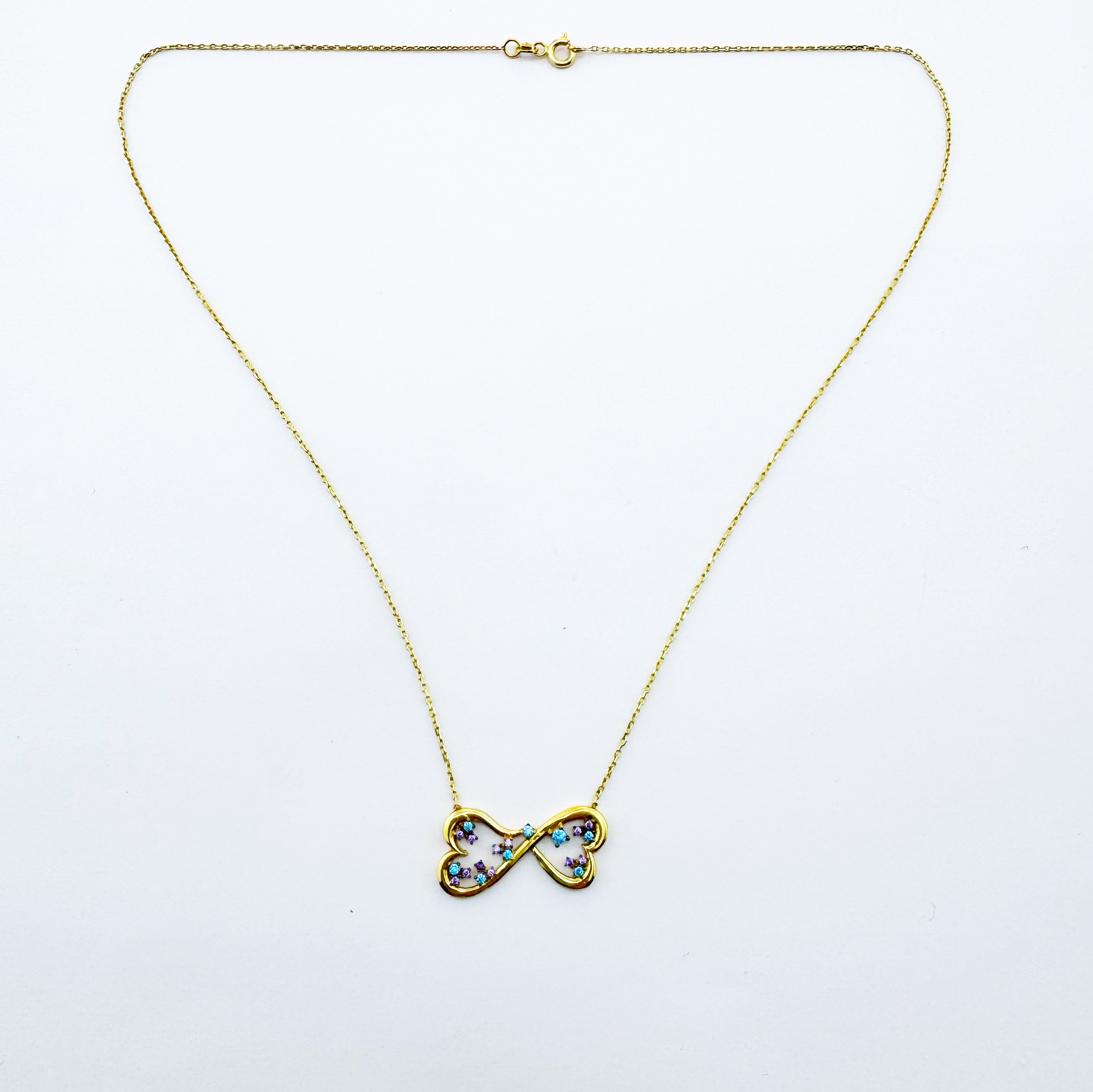 Design : Chaîne fine avec pendentif en forme de symbole infini/double nœud entièrement serti de diamilites multicolores.